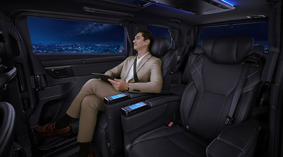 Uniknya, moon roof juga dipasang memanjang ke belakang di sisi kiri-kanan ceiling storage yang memberikan kebebasan kepada masing-masing penumpang untuk menikmati pemandangan langit atau menutupnya supaya dapat beristirahat dengan tenang. Semakin private dan nyaman, power sunshade dipasang di dalam frame kaca samping yang rapi, memungkinkan penumpang untuk mengurangi panas sinar matahari sambil tetap menikmati pemandangan keluar.
