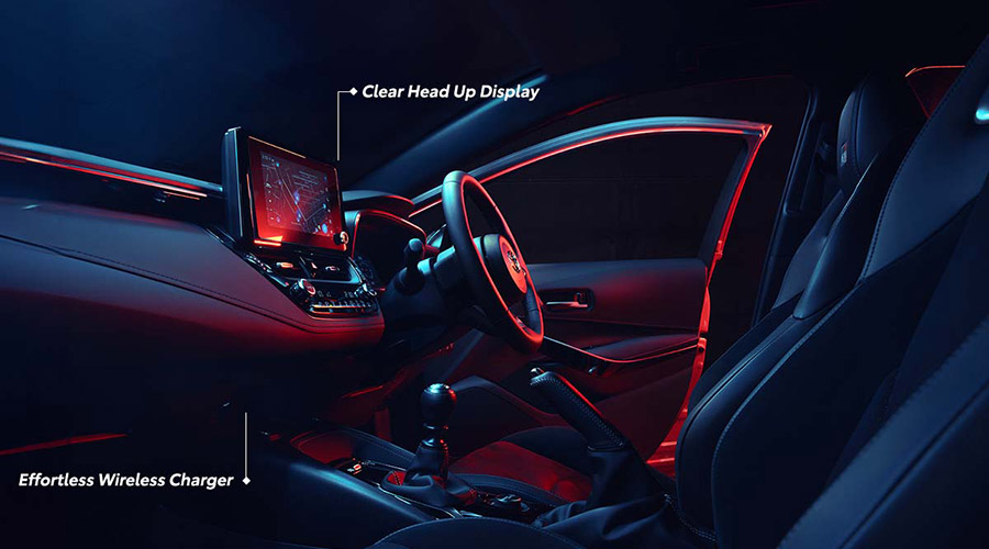AC dual zone digital bersama parking brake dan tuas transmisi berbalut kulit, serta 4WD mode switch. Di atas leather steering wheel dengan logo GR, terdapat head up display (HUD) untuk memudahkan pemantauan indikator mobil. Pedal alumnium dan soket USB melengkapi fitur di dalam kabin GR Corolla.